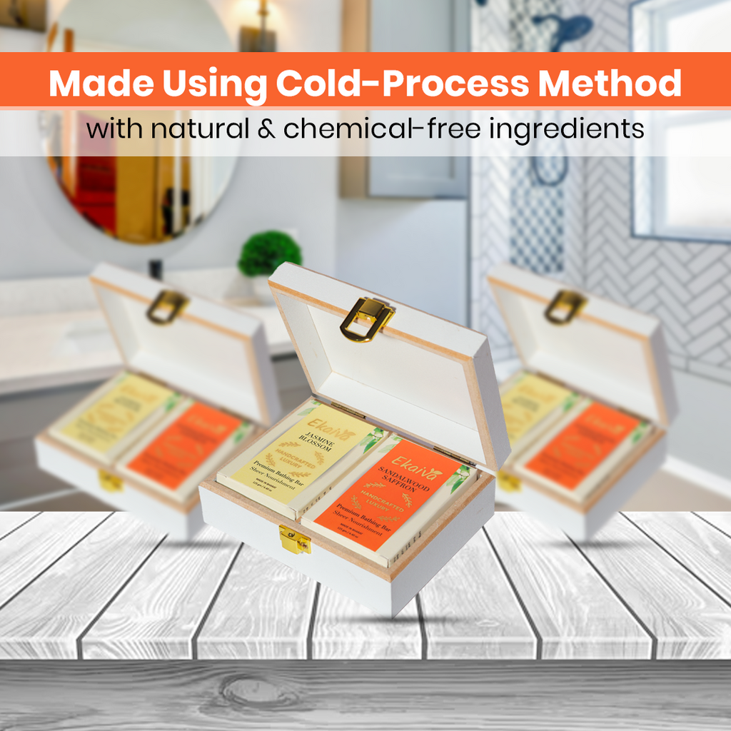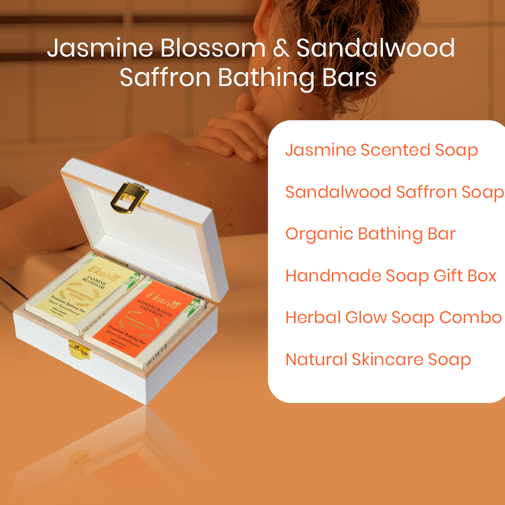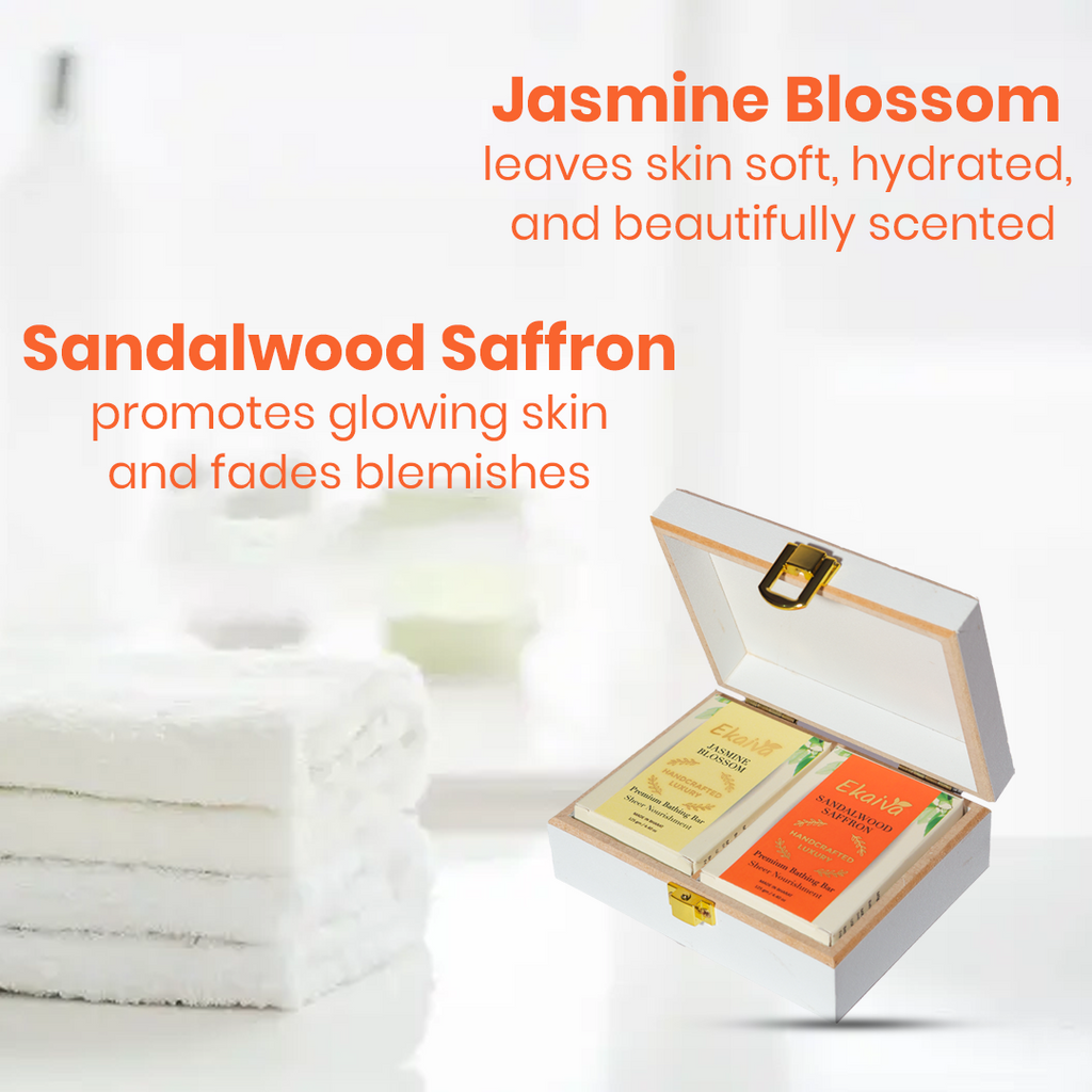 • Discover the ultimate in luxury and indulgence with the All Season Luxury Gift Box Classic Collection, featuring an exquisite engineered wooden box that contains two opulent bathing bars: Jasmine Blossom and Sandalwood Saffron. The Jasmine Blossom bar delivers a lush and soothing experience with its enchanting floral fragrance. Infused with the essence of jasmine flowers, this bathing bar provides a gentle, creamy lather that cleanses and nourishes your skin, leaving it soft, smooth, and delicately scented. The Sandalwood Saffron bar combines the timeless elegance of sandalwood with the exotic touch of saffron. Sandalwood is known for its calming and moisturizing properties, while saffron adds a touch of luxury and radiance. This bar offers a rich, aromatic experience that not only cleanses but also rejuvenates and enriches your skin, leaving it feeling pampered and glowing. Packaged in a beautifully crafted engineered wooden box, this classic collection is perfect for gifting or for treating yourself to a luxurious bathing experience. The sophisticated design and high-quality ingredients make this set a symbol of elegance and indulgence, ideal for any occasion or simply to enhance your daily self-care ritual.